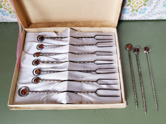 10 Cocktail Spiesse und Gabeln versilbert mit Bernstein VINTAGE im Originalkarton
