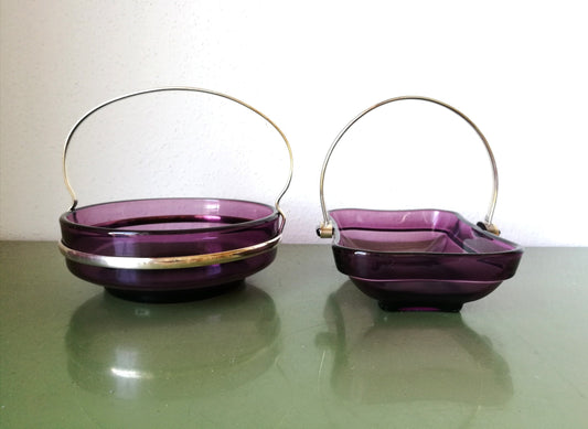 2 lila Anbieteschalen Glas mit versilbertem Griff VINTAGE 1950er
