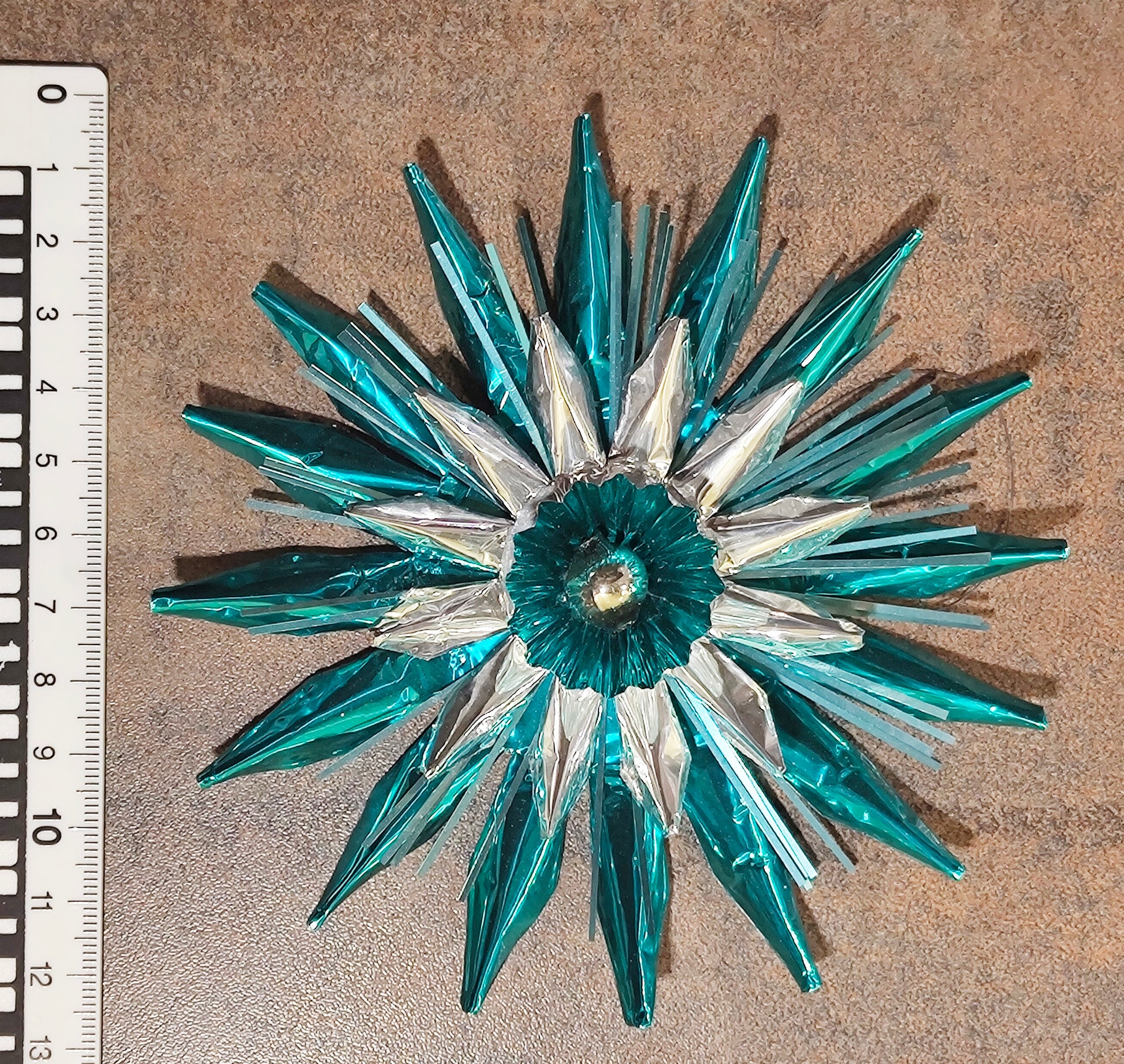 Jede Farbe ist zweimal vorhanden. Ganz dünnes Aluminium wurde hier zu schönem, funkelnden Christbaum Schmuck verarbeitet.