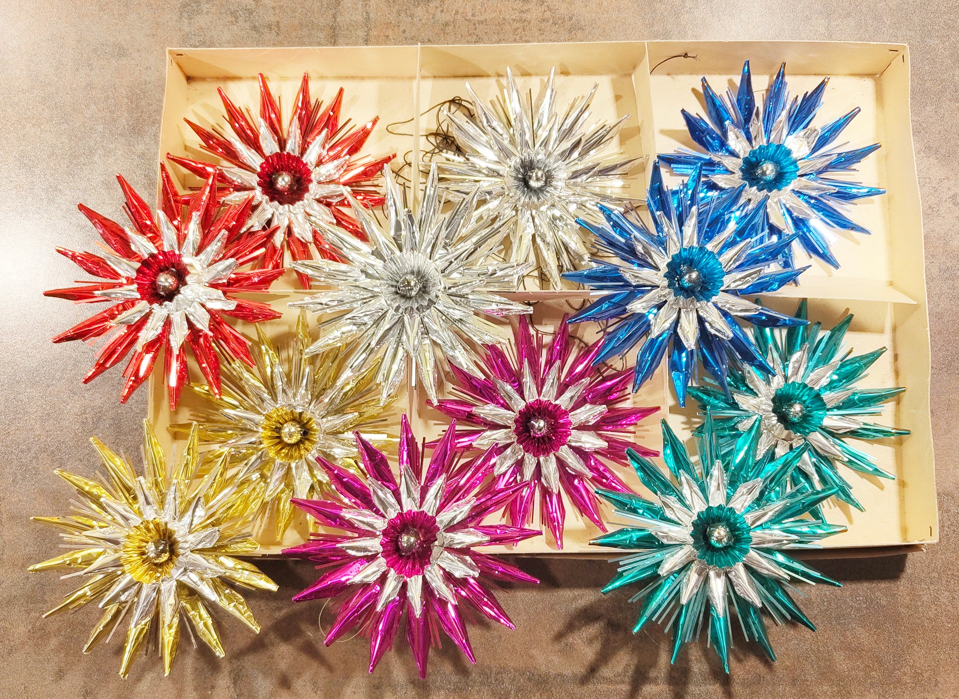 12 bunte fast unbenutzte Aluminium Sterne im Original Karton VINTAGE 1960er