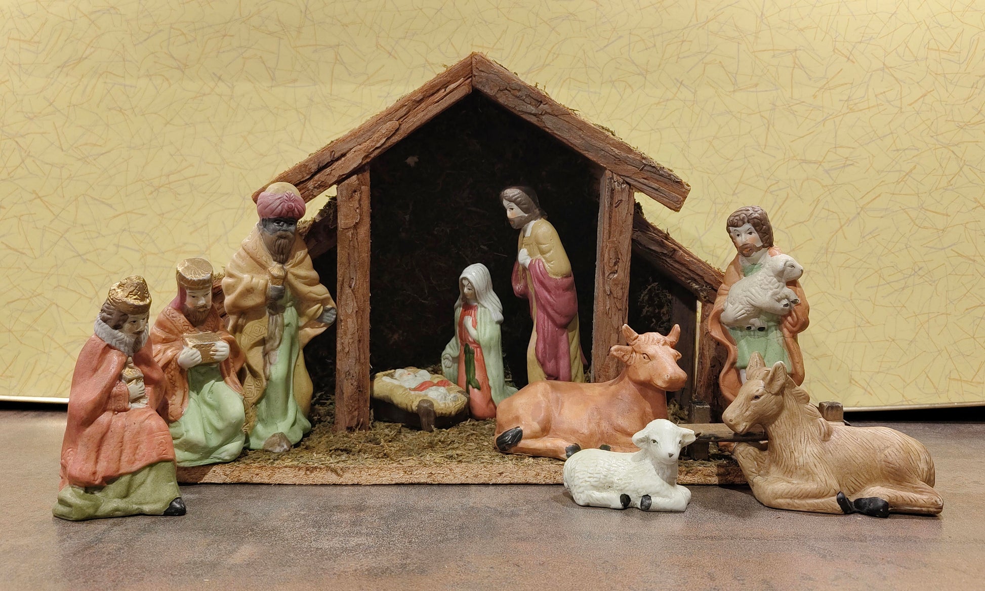 Die Krippe besteht aus einem stabilen Holzstall mit ein bisschen Rest an Moos Deko und enthält handbemalte Porzellanfiguren: Maria, Josef, das Jesuskind in der Krippe, die Heiligen Drei Könige, einen Hirten mit einem Schaf in den Armen, Ochs, Esel und einem Schaf. Alle Figuren sind mit feinen Gesichtszügen und warmen Farben gestaltet.