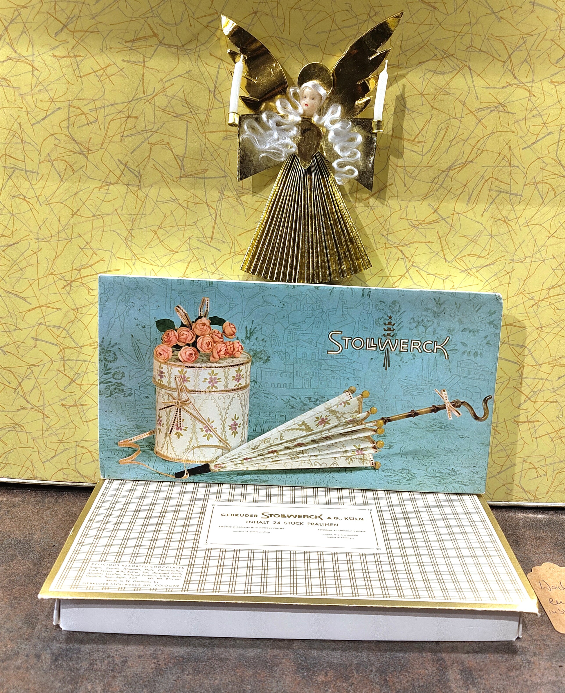 Vintage Wachsengel aus Aluminium in Stollwerk Pralinen Verpackung 1960er